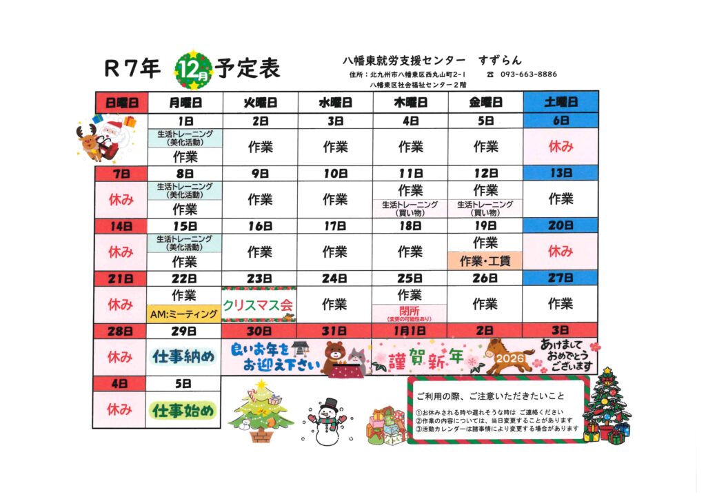 八幡東就労支援センターすずらん R7/12月カレンダー