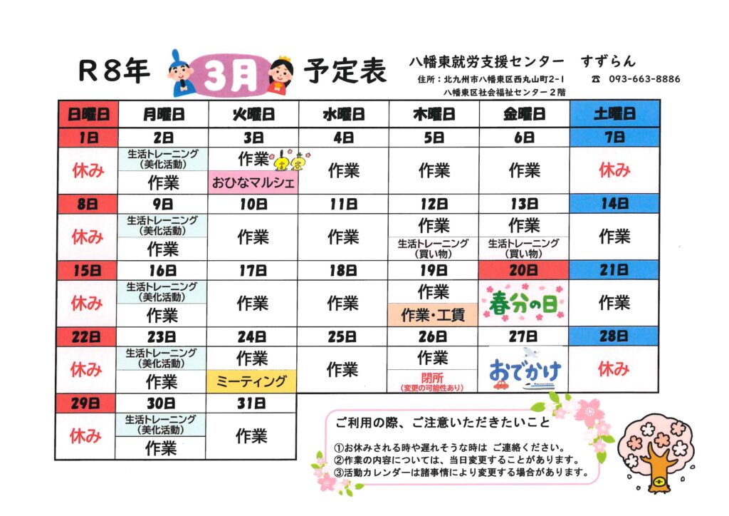八幡東就労支援センターすずらん R8/3月カレンダー